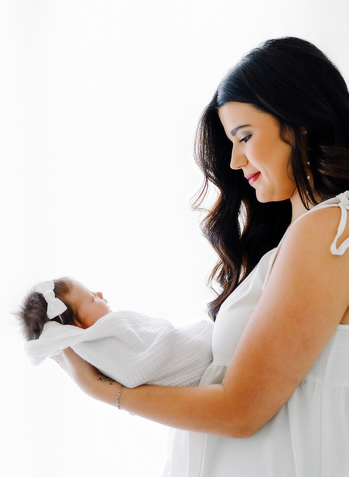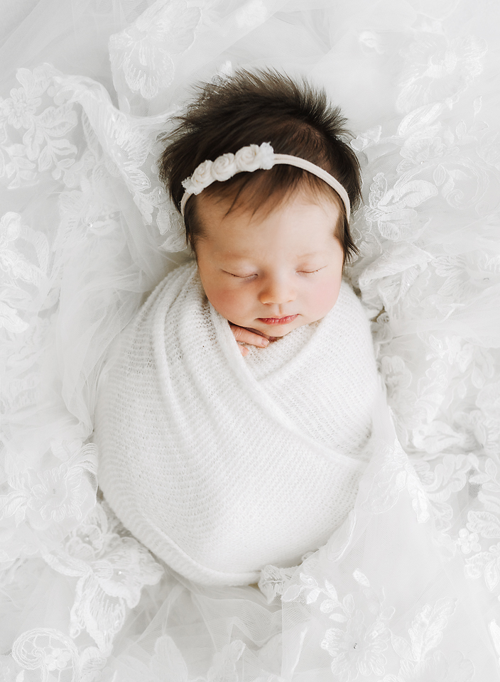 There can still be so much variety when shooting on white by changing up the props and textures. I used different blankets and changed wraps and accessories throughout Laynie’s photo session. I finished her session with her mother’s beautiful wedding veil. I love when mothers bring in special heirlooms to personalize their portrait session.